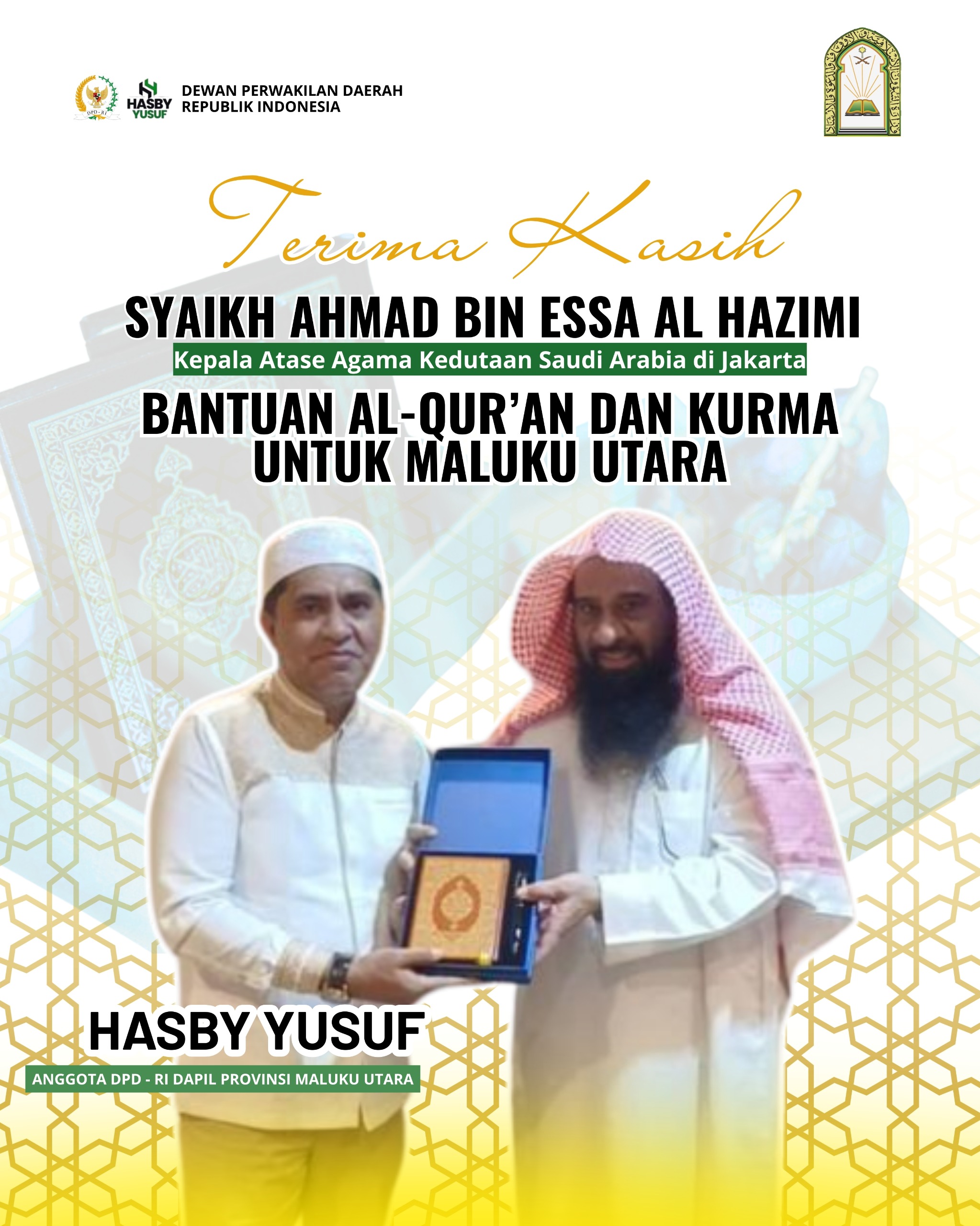 Jakarta_IP, Anggota Dewan Perwakilan Daerah Republik Indonesia (DPD RI) Daerah Pemilihan Maluku Utara, Hasby Yusuf, menyampaikan terima kasih dan apresiasi kepada Kepala Atase Agama dan Pendidikan Kedutaan Besar Arab Saudi, Syeikh Ahmad Bin Essa Al-Hazimi, atas bantuan berupa Al-Qur’an dan kurma.